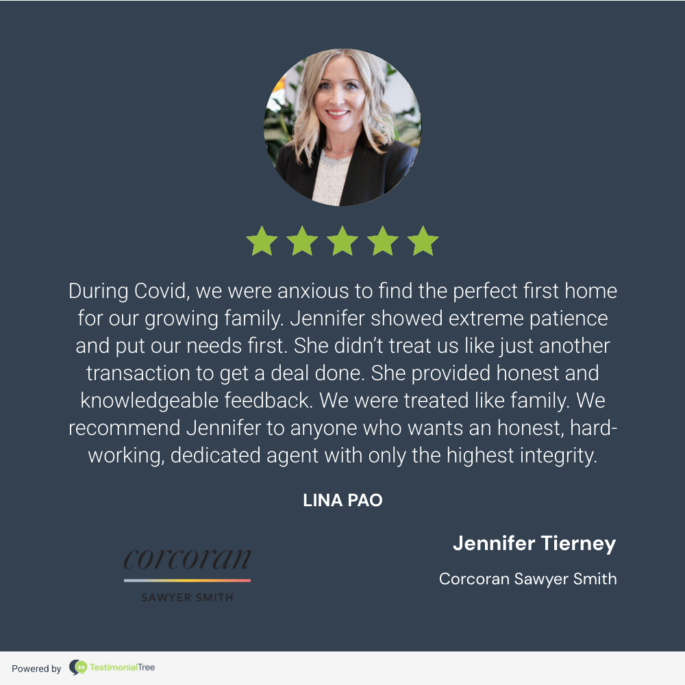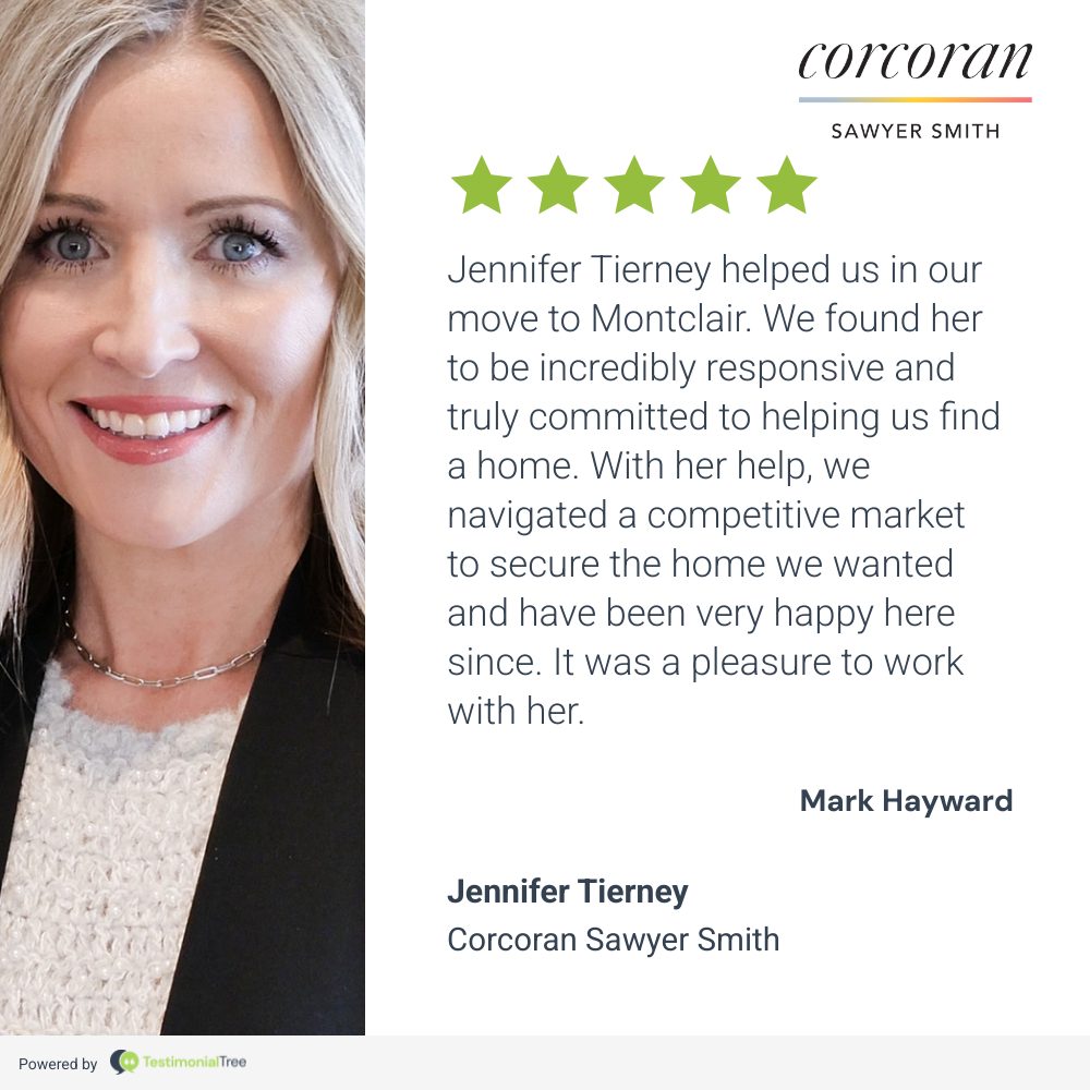 Jennifer Tierney helped us in our move to Montclair. We found her to be incredibly responsive and truly committed to helping us find a home. With her help, we navigated a competitive market to secure the home we wanted and have been very happy here since. It was a pleasure to work with her.